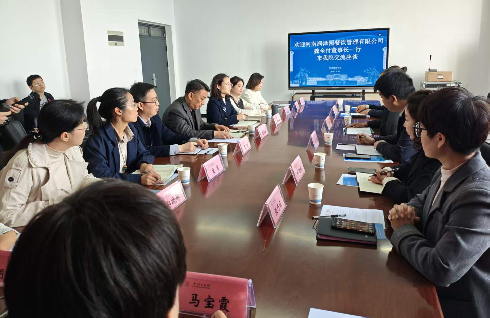 3月31日上午,河南润泽园餐饮管理有限公司董事长魏全付一行6人到太阳集团网址8722开展校企合作交流座谈。太阳集团网址8722院长杨玉敬、党委副书记李刚,法学院院长张晓东及相关专业教师参加座谈。